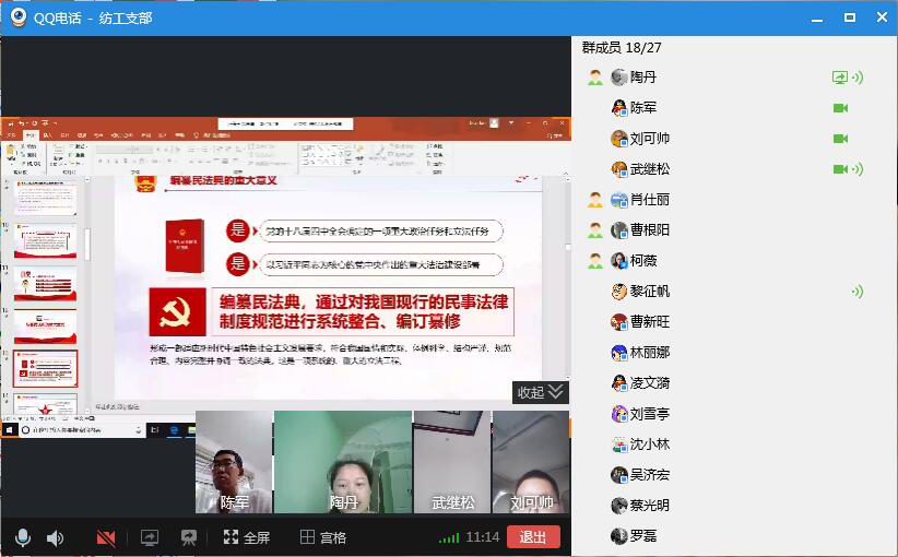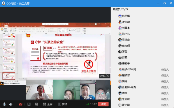 2020年6月30日晚6时,402永利集团纺织工程系教工党支部通过QQ视频开展“学习民法典”线上主题党日活动,会议由支部书记陶丹主持,全体教工党员参加。
