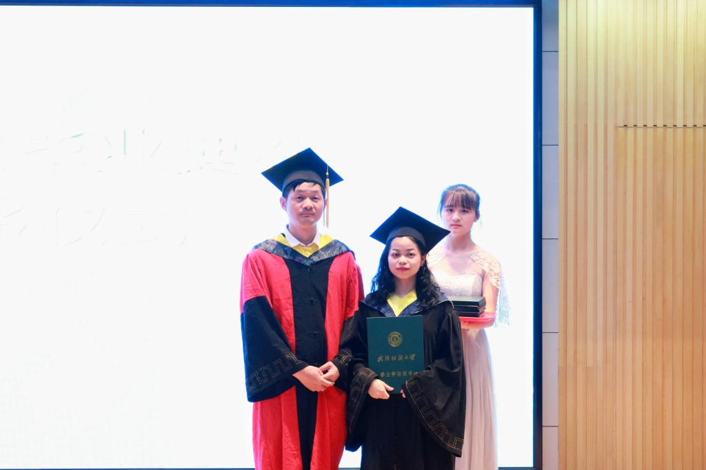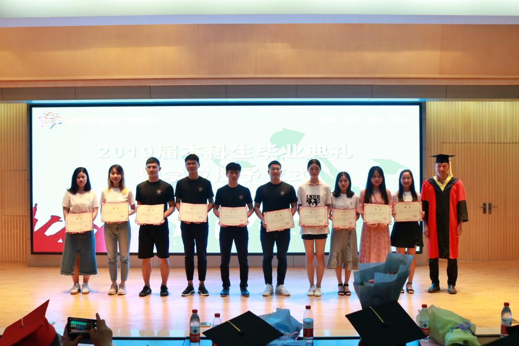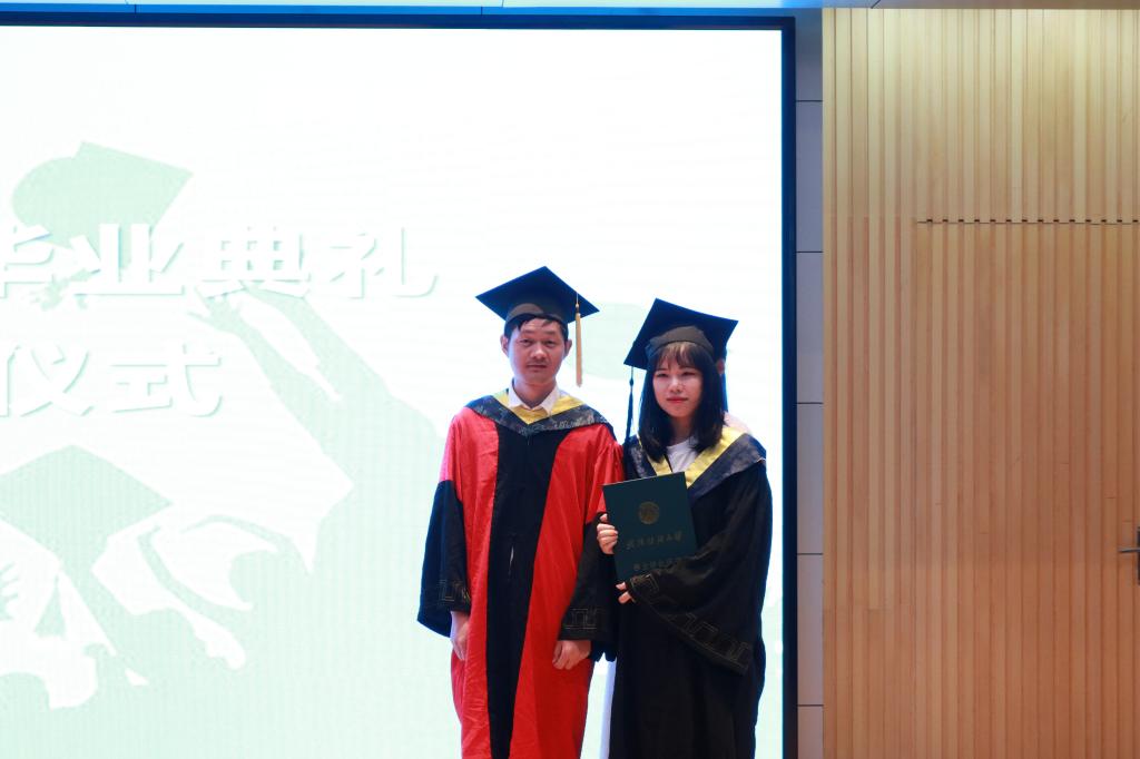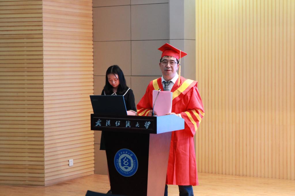 2019届本科生学位授予仪式开始。本次学位授予仪式由蔡光明教授主持,纺织工程系系主任曹新旺老师为2019届毕业生颁发学位证书,张尚勇经理为学士学位获得者拨穗,正冠。