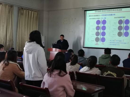 王教授就自己最近的学术研究进展和心得与大家进行了深入交流与分享。着重介绍了静电纺丝的优势、种类、结构及超细纤维在纳米蛛网传感器制造,表面能梯度和差动毛细效应驱动单向导湿和防水透湿纳米纤维膜,以及非织造布仿生树状分叉结构且环境友好型光催化自清洁纳米纤维膜等方面的内容。公司老师和同学与王教授进行了提问和充分交流,并与王教授探讨、请教了静电纺丝领域的一些前瞻性和共性问题。老师和同学们纷纷表示本次讲座开阔了视野,收获很大,期待公司今后更多举办类似的学术讲座,提高公司的科研和学术氛围。