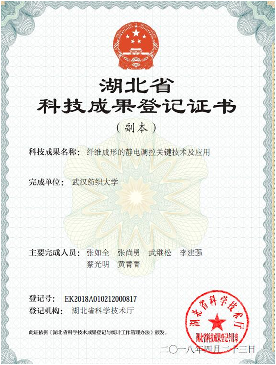 4月16日,湖北省技术成果交易所组织专家评审会,对公司张如全教授领衔的“纤维成形的静电调控关键技术及应用”成果进行技术评价。专家们对该成果的创新性、成熟度及应用成效等方面给予高度肯定。《科技成果评价报告》(鄂技交评字[2018]第104号)的结论为:该项目技术成果创新性突出,整体达到国际先进水平。据悉,该项目组在近十年的研发及应用过程中获授权发明专利15项,成果在省内外多家企业转化应用产生了良好的社会与经济效益。