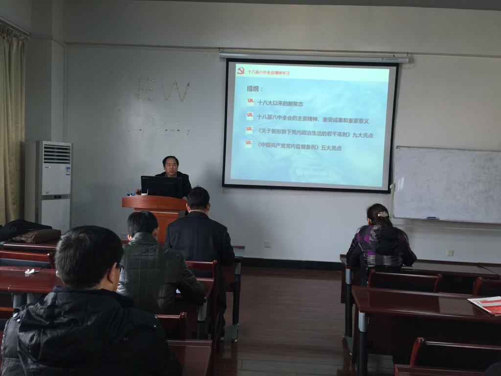 李相朋处长的宣讲系统化的解读了党的十八届六中全会精神,与会党员深受启发,纷纷表示要学好学透十八届六中全会精神,把学习动力精神动力转化为工作动力,为推进公司十三五规划的进一步实施贡献自己的力量。宣讲会结束后,402永利集团教师党支部组织开展了12月份主题党日活动并布置党建督查的相关任务。