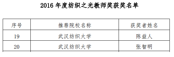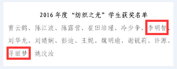 日前,为贯彻落实国务院颁发的《教学成果奖励条例》的文件精神,中国纺织工业联合会开展了纺织公司产品成果奖的评选活动。公司陈益人教授获得2016年度“纺织之光”教师奖;非织11301班李明智、纺织11404班寻丽梦等两名员工获得2016年度“纺织之光”员工奖。