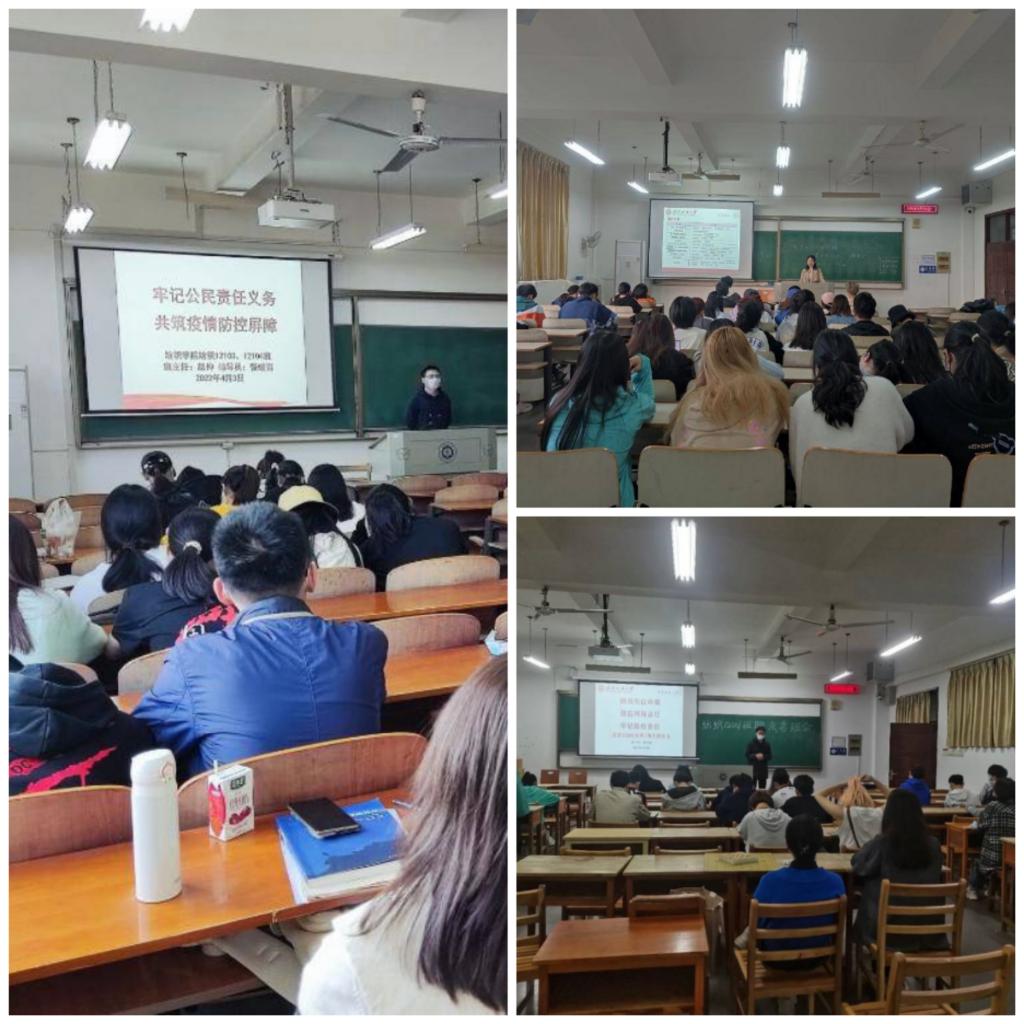本期班会,班主任们深入细致地向各自班级的同学详细介绍了近期各级政府的疫情情况通报,温馨提醒同学们一定要“牢记公民责任义务,共筑疫情防控屏障”。纺织工程31801班班主任黄娟老师提醒班上的同学,要重视并配合公司要求,树立责任感和公民意识,如有关于公司的好意见、好建议以及困难、疑惑都可以及时与她、或者辅导员、副书记反映,全体同学们要落实好个人防疫义务和责任,做到“非必要不离校,不离汉”。