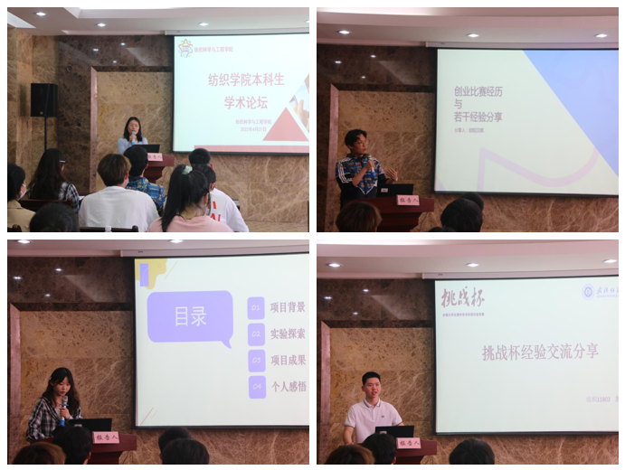 本期论坛由三名本科生开展报告分享。纺织工程51802班的欧阳汉镇同学以《创业比赛经历于若干经验分享》为题进行了分享,他从项目介绍与创赛价值两个方面介绍了自己团队运用RPA(机器人流程自动化)技术参与创业比赛的经历,并从创新、队友、项目包装、组别选择几个方面分享了自己两年创业比赛经验。纺织工程11903班的雷雨声同学以《药物缓释功能与织物及纱线性能探究》为主题,介绍了目前自己课题组中的项目背景、实验探索及取得的项目成果,号召同学们坚持内心对于科研和学术的热爱,保持健康积极的心态,大胆创新、不言放弃,虚心学习。纺织工程11802班的郭世贸同学做了《挑战杯经验交流分享》的报告,分享了自己在竞赛中的经历与收获以及遇到过的困难与解决困难的方法并以“韧忍仁”的精神激励同学们积极参与科研。