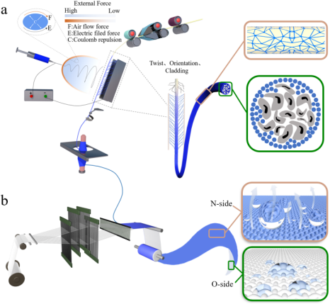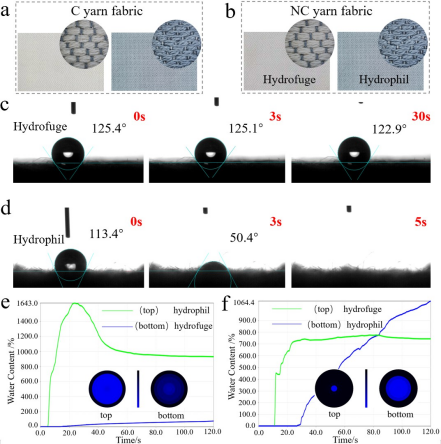 图3(a)和(b)表示C和NC纱线与蓝色棉纱交织形成双面织物。显然,NC纱织物表面更光洁。NC纱线织物两面具有相反的透水性能有:液压分离(N侧)和亲水(O侧),MMT测试结果如图3(e)和(f)所示。该研究结果以“Qualified nano-composite yarn for hydrophobic fabric via online nano- and micron-fiber composite spinning”为题,发表在Textile Research Journal(DOI: 10.1177/00405175221124357)期刊上。论文的第一作者为402永利集团研究生齐硕,硕士生俆傲、刘佳鑫协作完成,通讯作者为402永利集团徐卫林院士团队的夏治刚教授。该研究得到了湖北省科学技术厅、武汉市科学技术局基础研究等项目的支持。