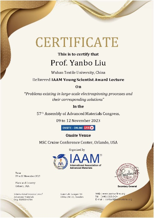 日前,402永利集团非织造材料与工程系刘延波教授作为2023年度国际先进材料协会(IAAM)青年科学家奖章(Young Scientist Medal)获得者受邀参加了于2023年11月9~12日在美国奥兰多市举行的第57届先进材料世界大会(57th Assembly of Advanced Materials Congress), 并作了题为“Problems Existing in Large-scale Electrospinning Processes and their Corresponding Solutions” 的大会报告(IAAM 青年科学家颁奖演讲),会后收到了报告证书和奖励证书,本年度共有3名中国科学家获奖。