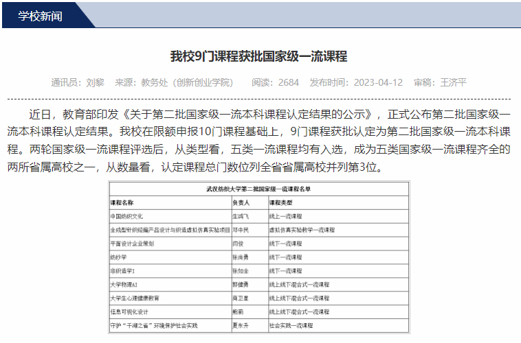 5.获批国家级一流课程3门、中纺联教学成果奖11项,公司产品再提水准。《纺纱学》《非织造学Ⅰ》《全成型针织经编产品设计与织造虚拟仿真实验项目》获批国家级一流课程,获批省级一流课程4门,出版教材2部。获批中国纺织工业联合会纺织高等公司产品成果奖11项,其中特等奖3项、一等奖3项、二等奖5项。