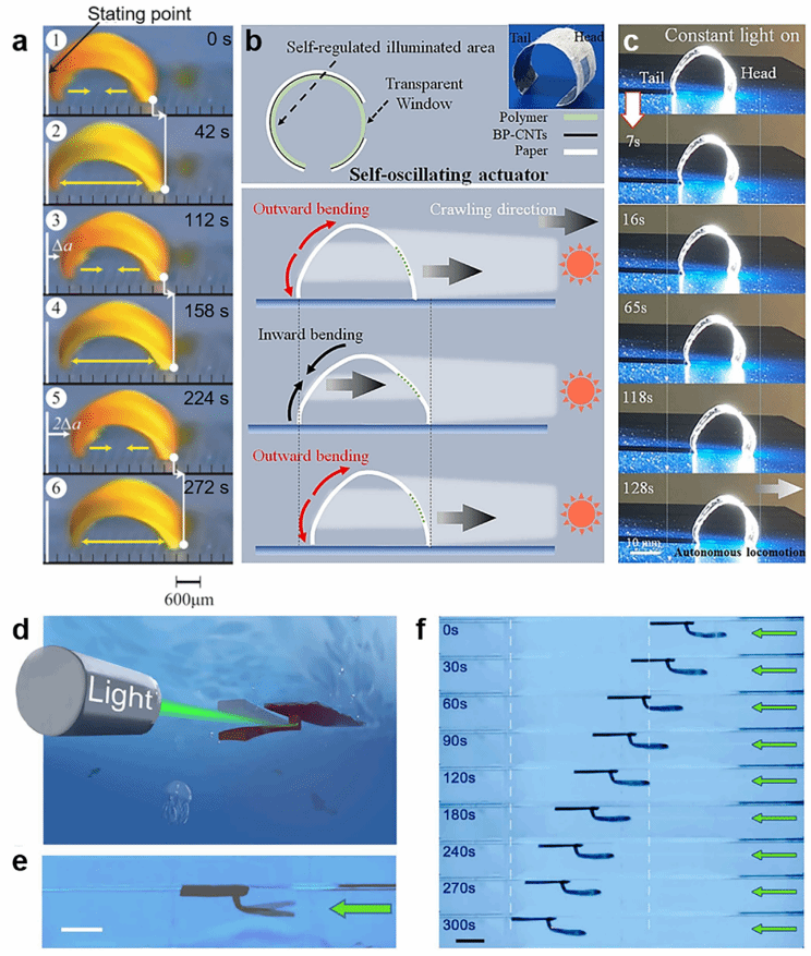 (b,c)基于 BP-CNT/纸质薄膜的自主爬行致动器,(d-f)自主游泳软体机器人