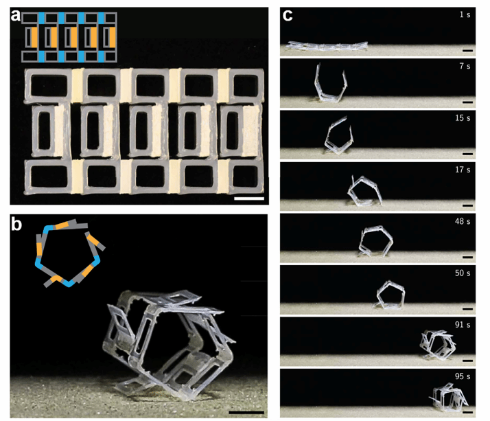 图8. 折纸基自振荡致动器(a-c)自主推进机器人的设计及自主运动