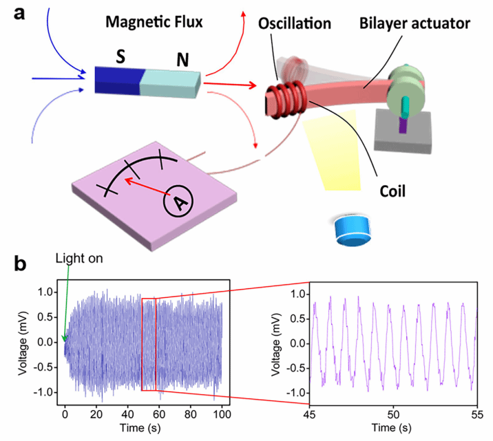 图10. 自振荡致动器的能量转换应用(a,b)发电机原理和自振荡致动器在光持续照射下的连续电输出