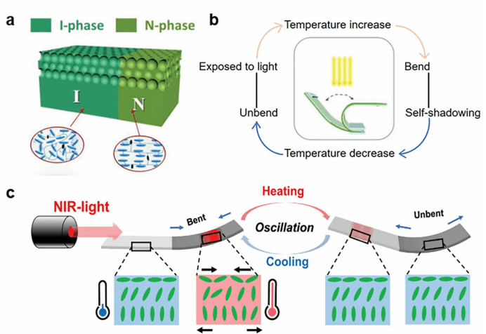 图5. 液晶自振荡致动器(a,b)LCN薄膜振荡机理,(c) PDA-LCN薄膜在近红外光下的振荡原理