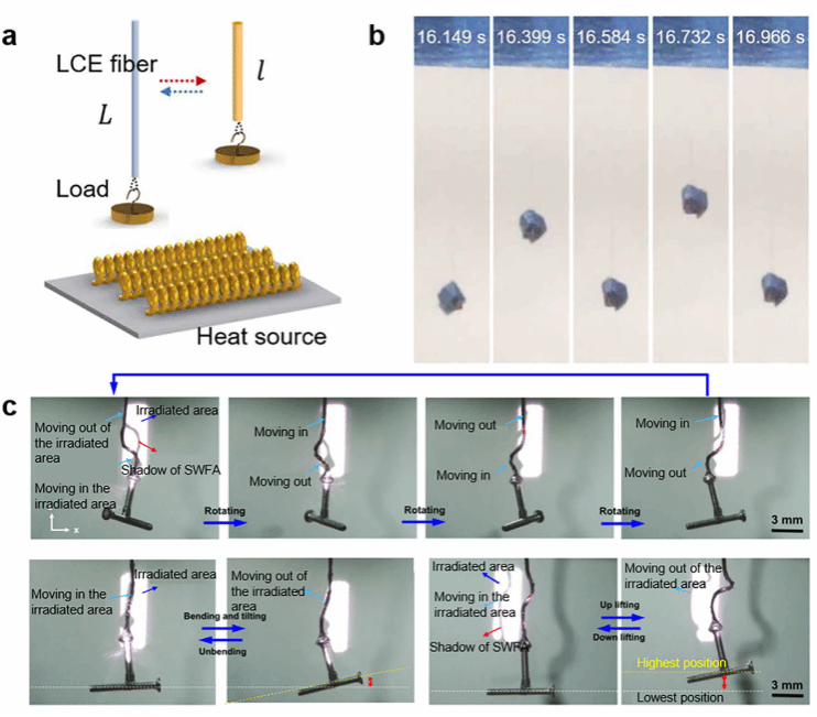 图7. 纤维基振荡致动器(a,b)LCE纤维在稳定温度场下的自振荡,(c)GO-LCE纤维多模式自振荡