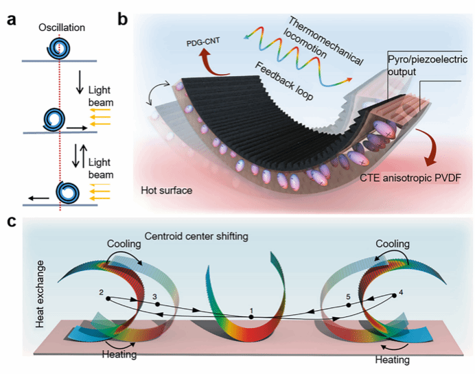 (b,c)基于PDG-CNT/PVDF致动器的热-机-电转换设计理念及振荡过程中热变化与重心移动