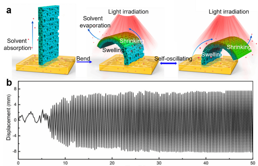 当前难以通过遮蔽发散光来实现自振荡。Liu等人基于多孔聚丙烯薄膜在近红外发散光下的光热溶剂蒸发和吸附衍生的交替体积膨胀和收缩实现了自振荡运动(图3a)。在800 mW cm-2的近红外光照射下,致动器产生微小波动,直至薄膜内部溶剂吸脱附达到平衡时,产生稳定的左右弯曲振荡(图3b)。振荡周期约为0.3秒获得的振荡位移为15.7mm。特别地,在溶剂连续供应和恒定的光照下,振荡运动永远不会停止。