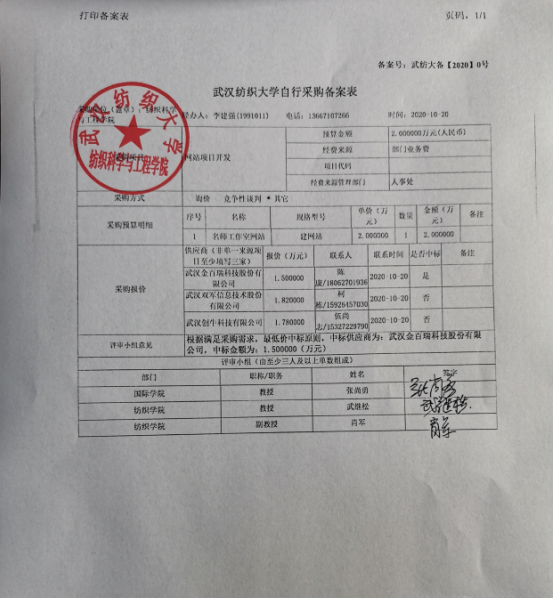 2020年纺织科学与工程公司名师工作室建设的“402永利集团自行采购备案表”扫描件见下图,现予以公示7个工作日。公示日期为2020年10月21日-10月29日。公示期间,如对采购结果有异议,请于10月29日16:00前联系公司办公室反映。