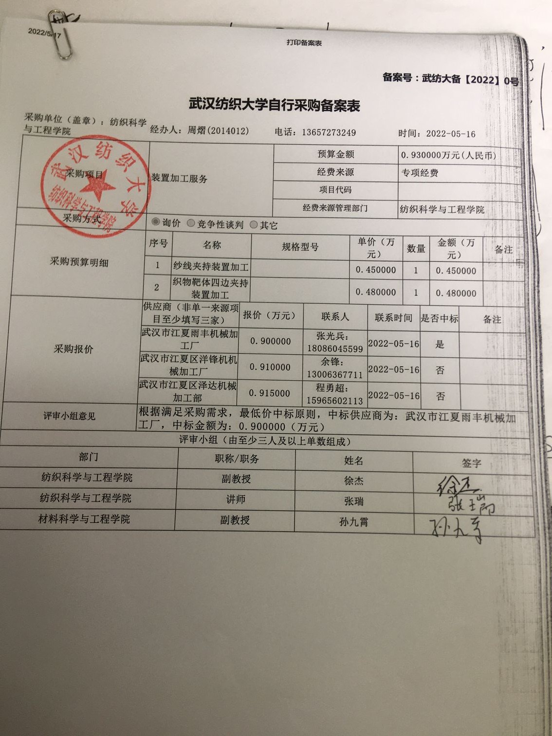 装置加工服务备案表