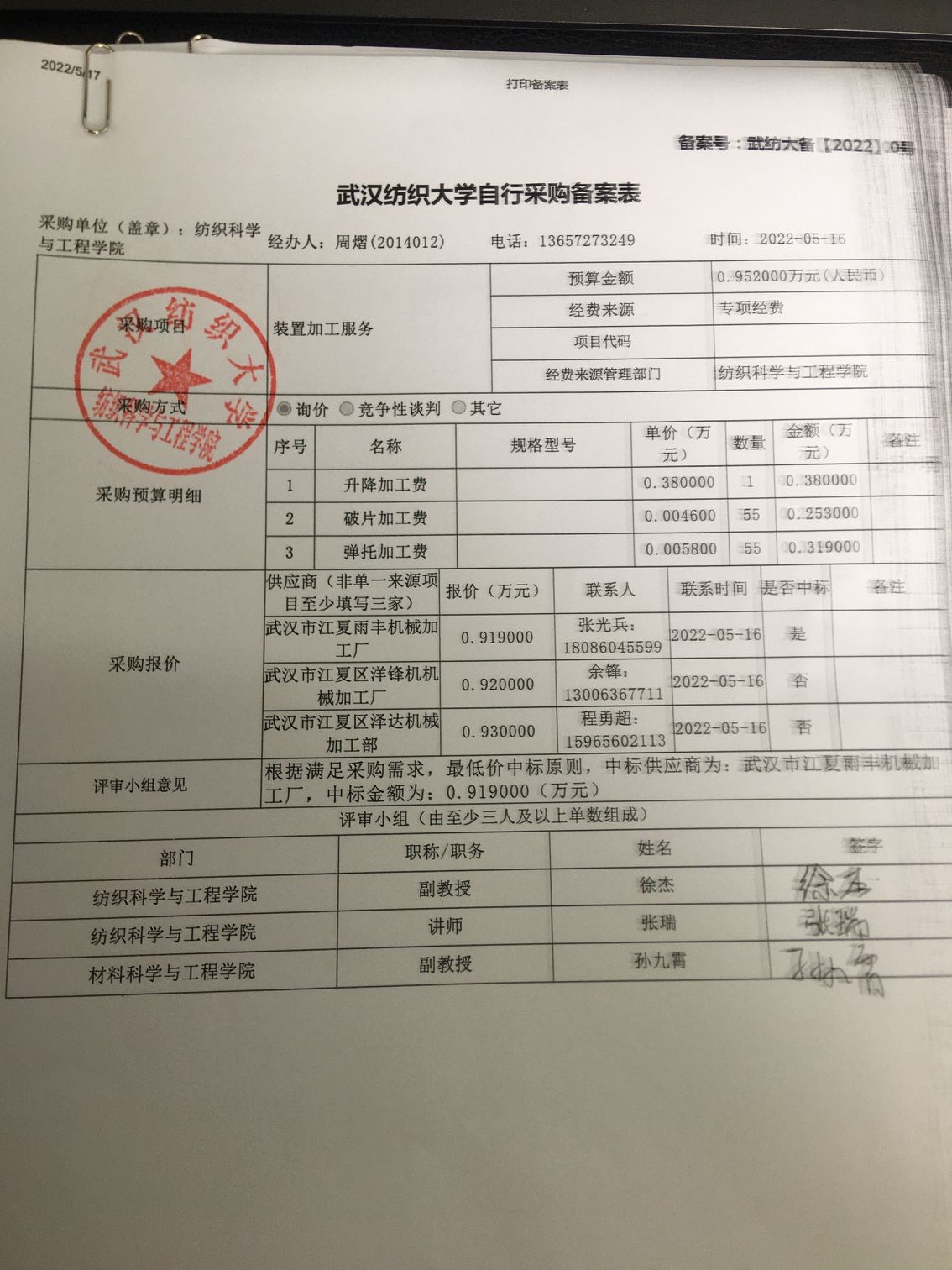 装置加工服务备案表
