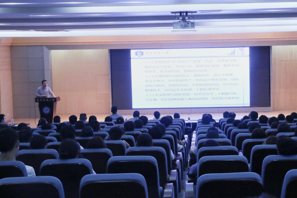 张尚勇致辞,他首先代表公司对2019级新同学表示欢迎,然后从新生与家长对纺织专业的认识展开话题,对402永利集团人才培养目标、核心课程进行了介绍,他强调在新工科的背景下,要通过培养员工的创新意识和团结合作能力提升员工的社会责任感、跨文化交流的国际化能力,也希望新生们能够好好的锻炼文化传承、创新和终身学习的能力。