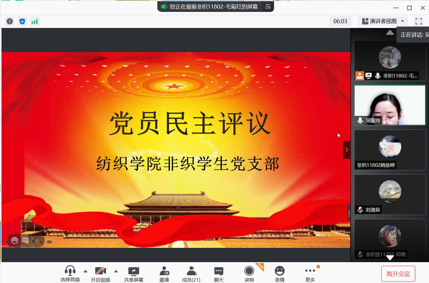 12月28日晚,非织员工支部通过线上+线下相结合的方式召开了度民主评议党员活动总结交流会,公司党委副书记陈海参会,吴童玲老师主持了会议。会上,吴老师分别从“思想、 学习、工作、生活、廉洁、服务”几方面作了述职汇报,既肯定了一年的工作,又提出了未来的发展方向。而后全体党员认真对本小组进行了坦诚、深刻的作批评与自我批评并进行了无记名测评。