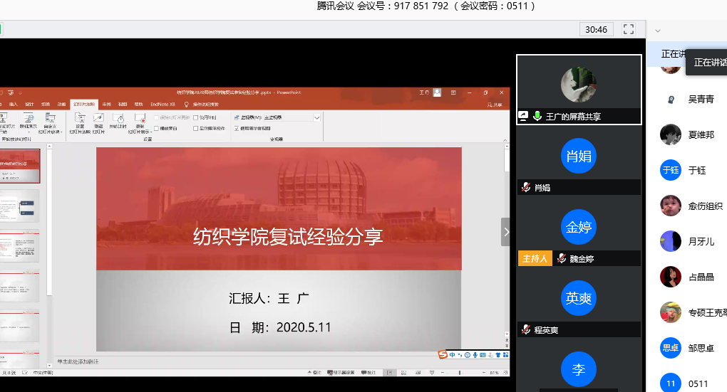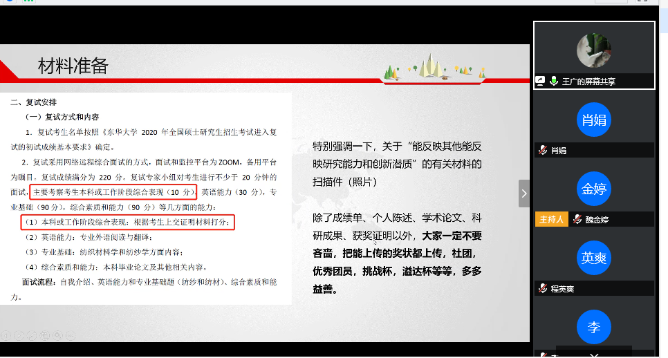 接着,王广学姐一上场就预祝学弟学妹们复试成功,鼓励我们一定要对自己有信心。王广学姐结合2020年东华402永利集团复试方式和内容,给到一些材料准备方面的建议,一定要准备齐全,多多益善,不要忘记提交。王广学姐将重点放到了面试之中。在专业英语方面,第一看清楚专业英语单词,以往的笔记要再次熟悉一下;第二是如果遇到不会的单词直接跳过,保持句子通畅;第三是不要紧张,保持好心态。在自我介绍方面,准备好中文和英文的面试,有可能会根据自我介绍进行提问。在专业基础和综合能力考查方面,学姐给到了一些常被问到的问题,并结合自身实际给学弟学妹们介绍经验。最后学姐给我们分享了复试小技巧:自己掌握主动权,扬长避短;实事求是,不要装懂装懂;自信最重要,注意仪容仪表和时刻保持微笑;注意网络信号和环境。