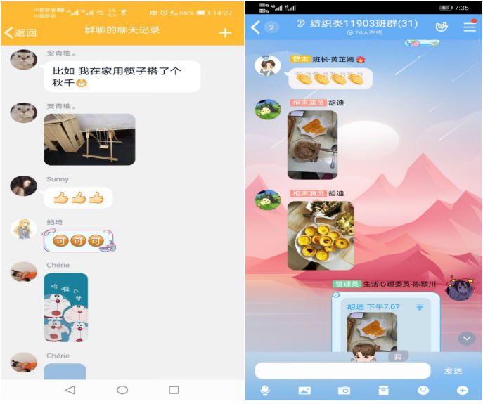 在线上活动中,同学们积极分享了他们在家中各项丰富多彩的活动,有些同学及早备战研究生考试、整理好各项复习资料;有些同学在完成日常学习任务后,还学习了许多新的技能:如烹饪、收纳和绘画等;还有的同学坚持运动,每天在手机APP上打卡各项体育锻炼活动等。