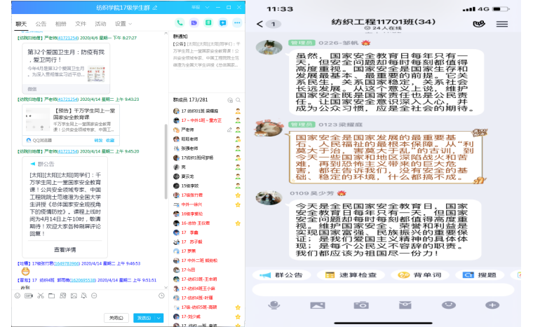 辅导员严蔷薇老师首先和17级同学们观看了中国工程院院士范维澄的《总体国家安全观视角下的疫情防控》在线课程,然后介绍了国家安全法律规定的政治安全、国土安全、军事安全、经济安全等11个领域的相关知识,最后大家就新时代老员工在国家安全方面担负的使命与任务进行了热烈的讨论。通过本次主题班会,员工们充分了解到当今国家安全面临的严峻形势,认识到国家安全对于老员工角色的重要性,充分提升了国家安全意识。