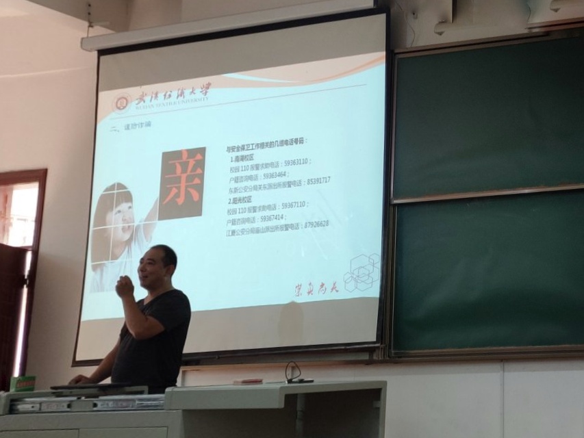 主讲人也分别从防抢、防火、交通灾难、意外事故等几个方面介绍了增强安全意识的重要性。他重点强调了防火的相关知识,介绍了火灾发生的原因:使用大功率电器,使用劣质接线板、充电器等,并通过火灾实例加深了新生们对火灾严重性的认识。