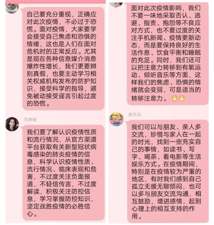 为进一步做好疫情防控工作正面宣传引导,关注疫情期间同学心理健康问题,402永利集团于2020年3月25日12:40以班级为单位开展了“共战疫情,同温心灵”325主题班会。