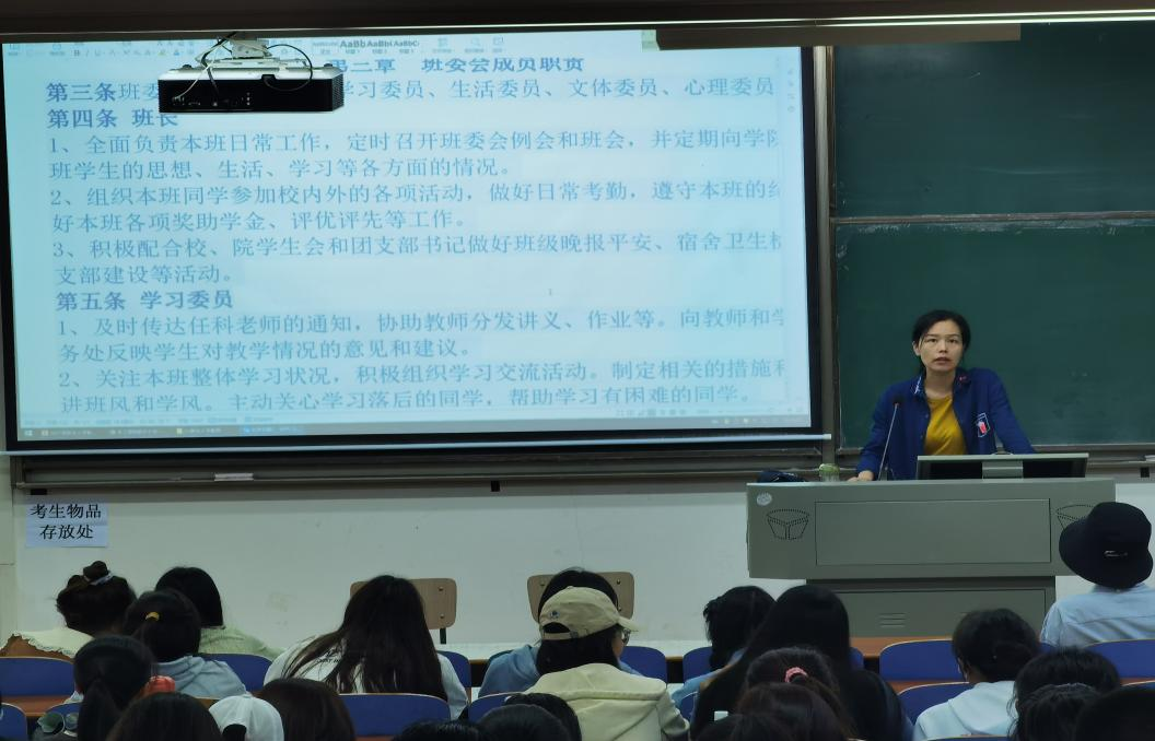 会议伊始严老师详细地为同学们介绍了公司绩点换算,评优评先,推优入党,礼仪及办事等规章制度,让同学们认识到综合素质评分对老员工的重要性。同时严老师也强调了对同学们大学四年的生活的期望,希望大家能够明确自己的目标,做好人生规划,为自己的目标制定更合理的时间安排。随后严老师还重点说明了班委对于班级活动的重要性,介绍了班委所承担的职责,并对班委们的工作表示肯定,鼓励各班班委继续努力,为班级班风的建立做贡献。
