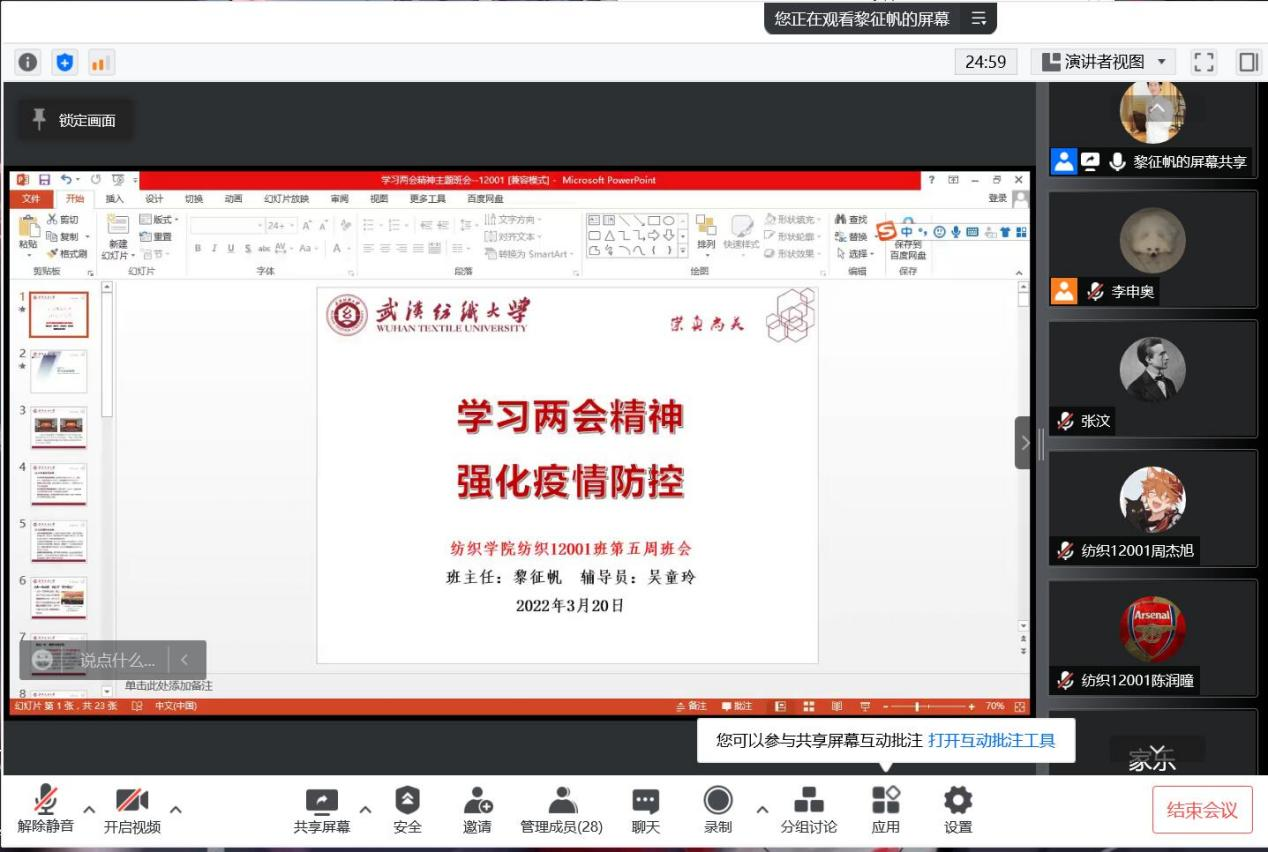 随后,通过观看十三届全国人大五次会议和全国政协十三届五次会议内容的视频,让同学们对“两会”内容有了更直观的认识,对国家所取得的成就及发展有了更深层次的了解。随后,班主任韦炜老师强调,党的百年奋斗重大成就和历史经验提供了重要认识论和方法论,要贯彻落实到日常学习生活中去,增强大家奋进新征程、建功新时代的信心和力量。最后,12106班韩瑶同学发表了自己学习两会精神的感悟,并表明一定努力为新时代中国特色社会主义高质量发展贡献出自己的一份力量。