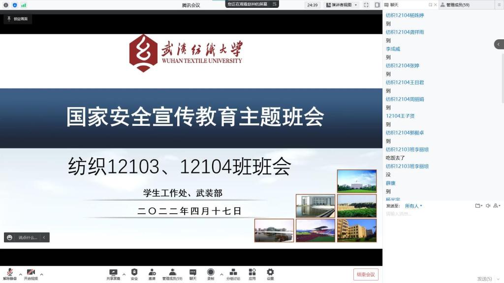 班会中,各班班长重点讲解了何为国家安全,提高了同学们对国家安全的认知,也组织同学们参与了与“国家安全”相关的线上活动,引起同学们对对国家安全的重视。纺织12101班班主任曾贝妮、纺织12103班班主任赵仲、纺织52102班班主任谭思睿、21级辅导员张竣青老师分别列举《中华人民共和国刑法》中危害国家安全罪相关发条内容及真实案例,让同学们认识到了危害国家安全的严重性,20级班主任罗磊、夏治刚老师向同学们列举了维护国家安全的方法以及注意事项,让同学们了解如何正确有效地维护国家安全。同时,19级班主任杨波、肖杏芳老师向同学们分析了全国及湖北省的疫情形势,呼吁同学们非必要不离校,此外,18级班主任黄娟、曹根阳老师通过几个真实案例呼吁同学们要牢记公民责任义务,共筑疫情防控屏障,并再次强调了疫情防控的相关规定,号召同学们自觉佩戴口罩,做好相应防护,坚持适当锻炼。