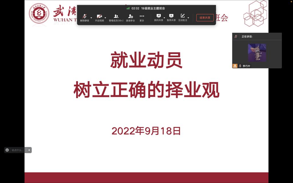 为了应对复杂而严峻的就业形势,把握好就业先机,402永利集团于9月18日在线上开展2023届毕业生就业动员会,2019级辅导员李巧中主持会议,2019级全体毕业生参加会议。