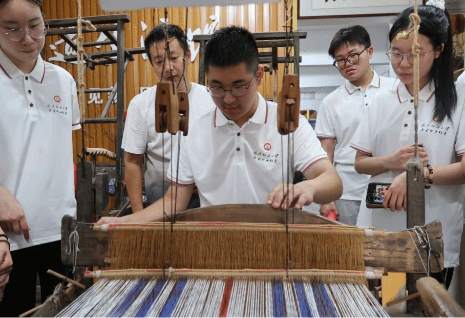 为赓续红色基因,弘扬纺织非遗文化,实践团成员前往红安将军红土布织锦农民专业合作社,与红安大布传统纺织技艺省级代表性传承人钟先梅和市级代表性传承人刘花珍进行深入交流,钟先梅生动地讲述了红安大布的工艺流程,要经过大大小小72道工序,其主要包括挽纱、染纱、浆纱、倒筒、牵经、穿棕、穿扣、上机、制梭心、织布等,一匹匹精美的红安大布,好似跨越了上千年的历史沉淀,默默诉说着红安人民的勤勉与智慧;实践团走进红安县非物质文化遗产保护传承基地,省级代表性传承人黄珍兰、市级代表性传承人陶文成向实践团的学弟学妹介绍织布机的结构和运行原理,展示自己制作的改良版织布机,实践团深入感受织布的魅力,零距离感悟红安大布制作技艺,全方位体验红安大布非遗文化。