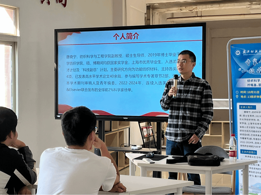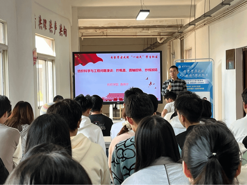 唐晓宁以“纺织科学与工程问题漫谈:拧瓶盖、圆轴扭转、纱线加捻”为主题,从生活中的拧瓶盖现象谈起,引申出《工程力学》中的圆轴扭转、《纺纱学》中的加捻三角区、《纺织材料学》中的捻回角计算,并介绍了《Science》杂志报道的通过扭转实现自发电的神奇Twistron纱线。他结合自身科研经历,通过对学科基础课、专业课及前沿科技成果之间脉络关系的梳理,深入浅出地告诉同学们要在生活中仔细观察现象,培养独立思考能力的道理,并分享了对于功能纺织材料领域当前学术前沿问题的独到见解,同时鼓励同学们多去图书馆阅读专业书籍,养成勤于思考的习惯,为纺织专业建设贡献力量。