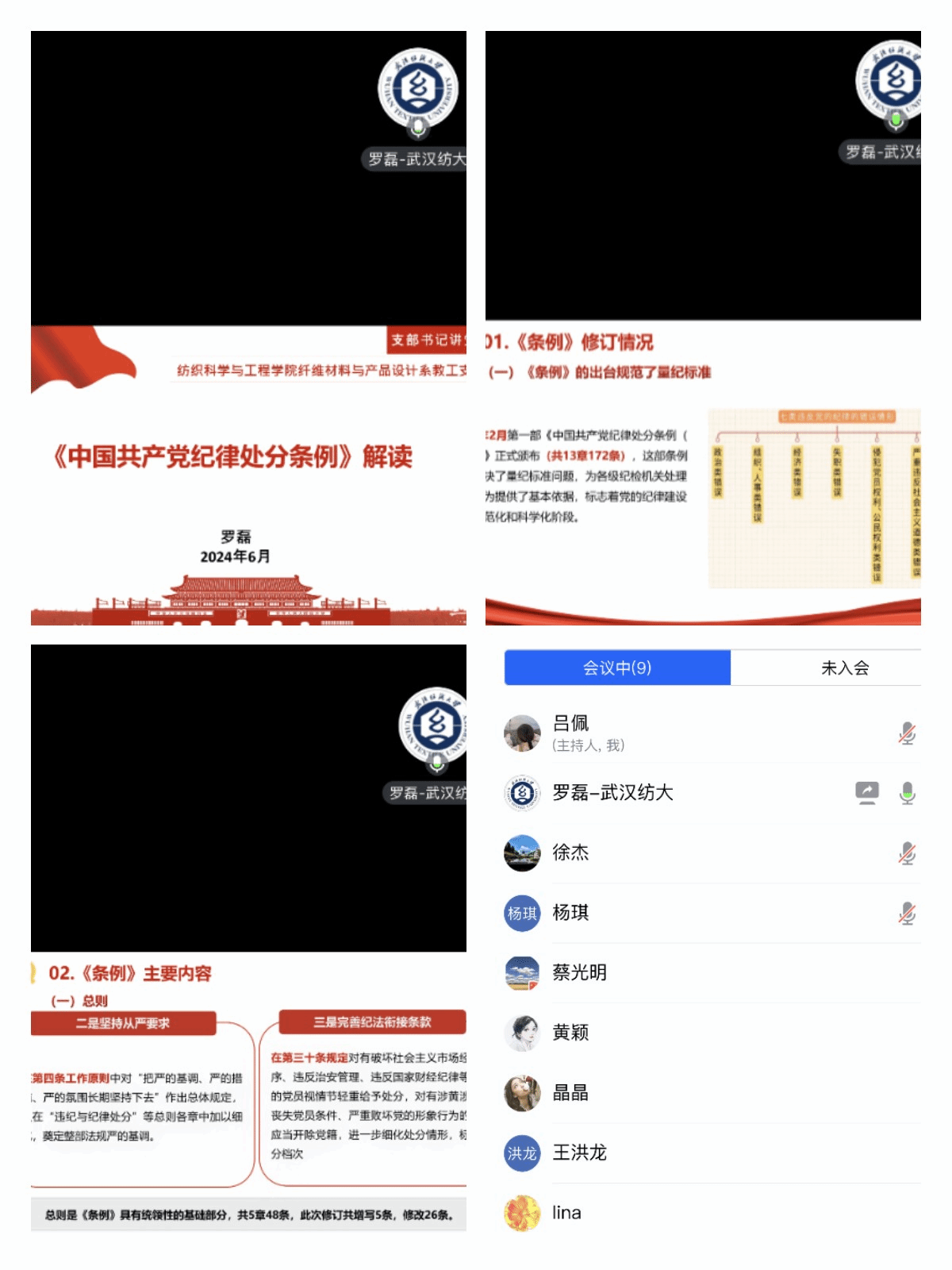 402永利集团员工党支部积极响应公司党委的号召,通过一系列形式多样、内容丰富的党纪学习教育,引导员工党员深入学习党的纪律规定,提升自我修养和政治责任感。402永利集团员工第一党支部、第二党支部、第三党支部集中学习了新修订的《中国共产党纪律处分条例》,强调了党员应具备的政治品格和使命担当。员工第一党支部向婷通过讲述身边优秀党员的模范事迹,激励员工党员们深入学习,严格要求自己;员工第二党支部书记王然强调了学纪、知纪、明纪、守纪的重要性;员工第三党支部书记张竣青通过身边师生党员的生动故事,激发了党员们学习先进、争当先进的热情。非织员工党支部书记吴童玲以“坚定理想信念,永葆党员本色”为核心,引导党员们自觉学法明纪,严格自我约束。通过重温党的六大纪律,党员们表示将自觉改进作风,树立新风。轻化工程专业员工党支部书记余国铖强调各位党员要从强化政治修养、自觉学法明纪、坚持立身为旗、学习模范事迹等四个方面增强纪律意识。研究生第一、第二党支部书记唐晓宁、梁祥云强调了纪律的重要性,指出纪律是管党治党的“戒尺”,也是党员、干部约束自身行为的标准和遵循。会议要求党员们学纪、知纪、明纪、守纪,将遵规守纪内化为言行准则,增强政治定力和纪律定力。