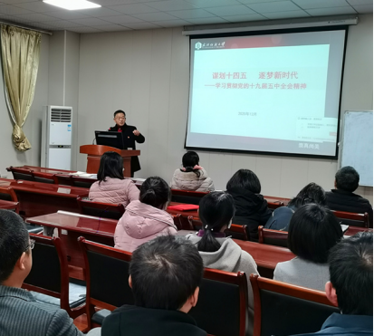 12月10日下午,402永利集团在8H502召开党的十九届五中全会精神宣讲会,公司宣讲团成员、校办主任杜新年为公司全体教职工作了《谋划十四五 逐梦新时代》的宣讲报告。报告会由公司党委书记张红鑫主持。 杜新年结合“十四五”时期的重要意义、十九届五中全会的重要内容,并围绕《中共中央关于制定国民经济和社会发展第十四个五年规划和二〇三五年远景目标的建议》和习近平总书记在全会上的重要讲话深入阐释了党的十九届五...