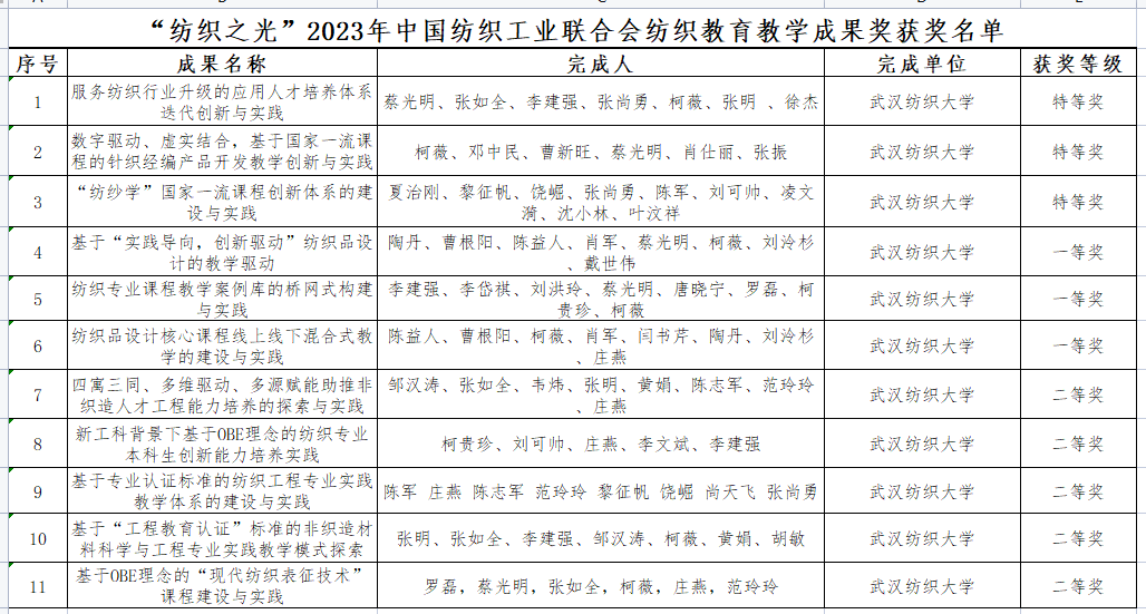 近日,“纺织之光”2023年度中国纺织工业联合会纺织高等公司产品成果奖评选结果揭晓,公司共有11项成果获奖,其中,教学成果特等奖3项,一等奖3项,二等奖5项。获奖数量实现历史性突破。“纺织之光”教学成果奖主要面向纺织行业院校,每隔两年评审一次,旨在鼓励教师积极开展公司产品研究和实践活动,共同促进纺织行业教育的发展。据悉,今年的纺织高等公司产品成果奖共评选出特等奖68项,一等奖153项,二等奖502项。 本次...